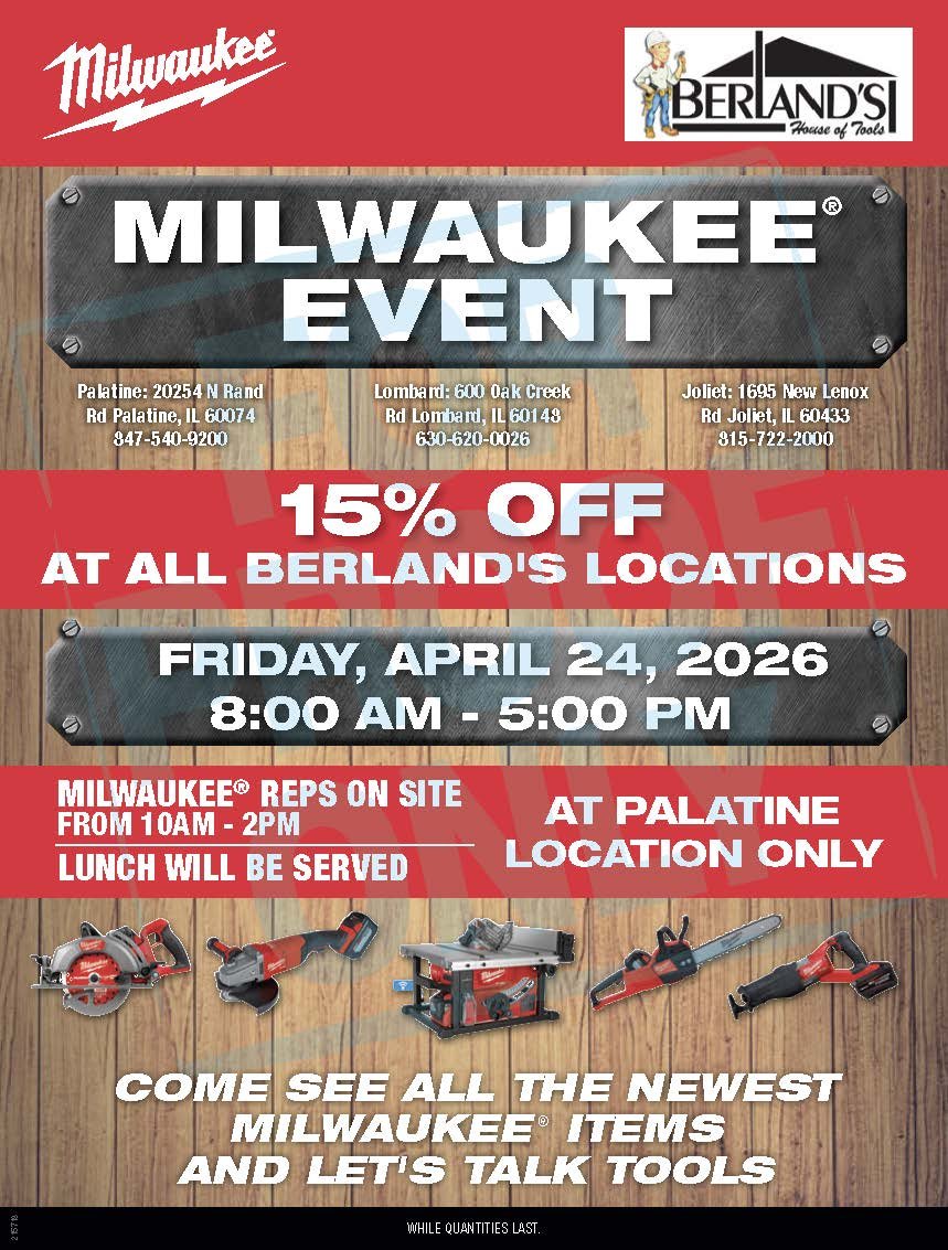 Milwaukee Sale Day Friday, April 24, 2026 8:00 AM 5:00 PM 08:00 17:00 Berland's House of Tools 600 Oak Creek Drive Lombard, IL, 60148 United States (map) Google Calendar ICS Mark your calendars now!!